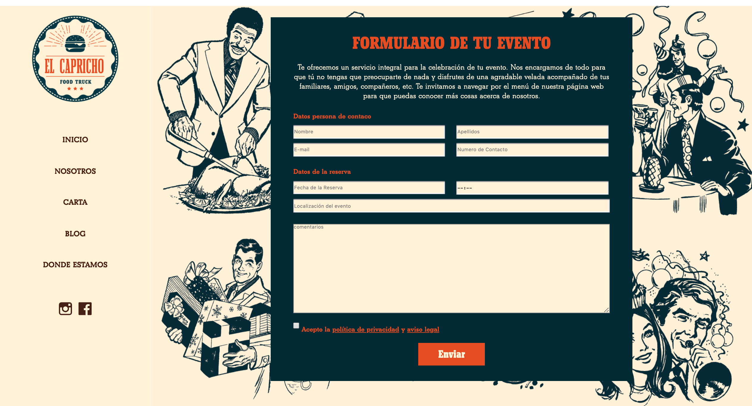 Diseño web para un servicio alternativo gastronómico como es el foodtruck de El Capricho. Un negocio con un fuerte caracter personal y una imagen corporativa a la que debíamos adaptarnos y potenciarla con una impactante carga gráfica.